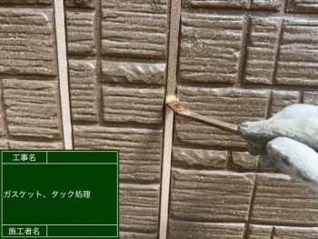サイディングの目地に「ガスケット」がはめられていたので、塗装後のべたつきを抑えるために専用のプライマーを塗ります。